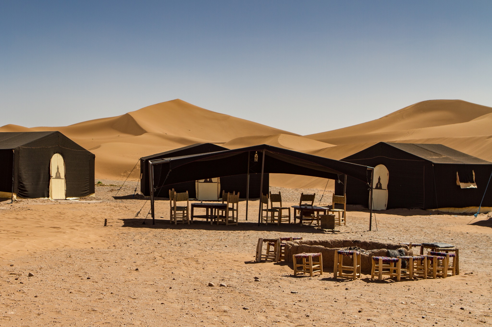 5 jours de parenthèse apaisante au cœur du désert, au départ de Marrakech ou Ouarzazate, avec hébergement en bivouac fixe tout confort, à proximité immédiate des dunes et des oueds.
